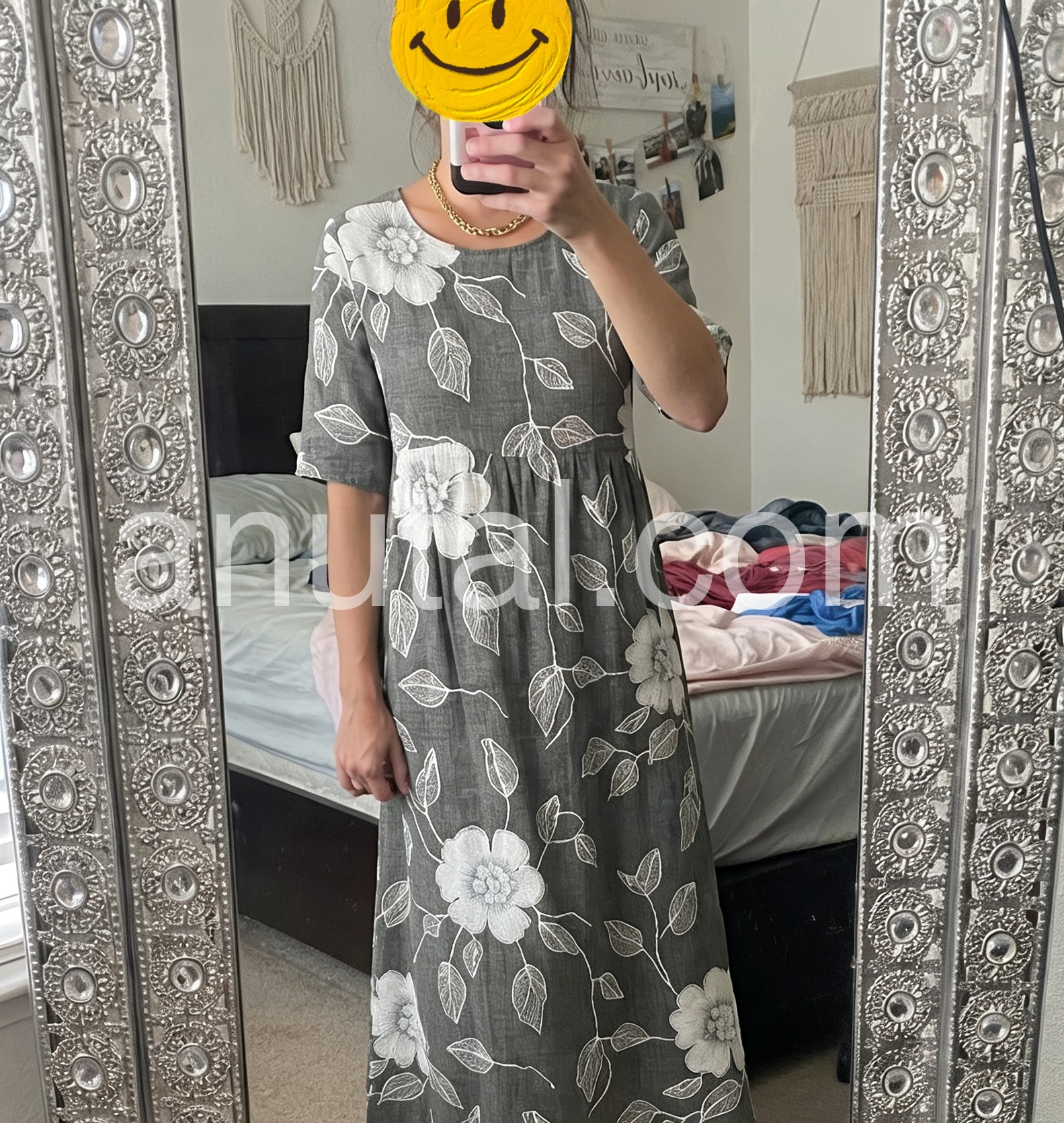 This midi dress reimagines timeless botanical art with a modern, relaxed silhouette. The charcoal base, printed with crisp white line-art florals, evokes effortless Mediterranean elegance.