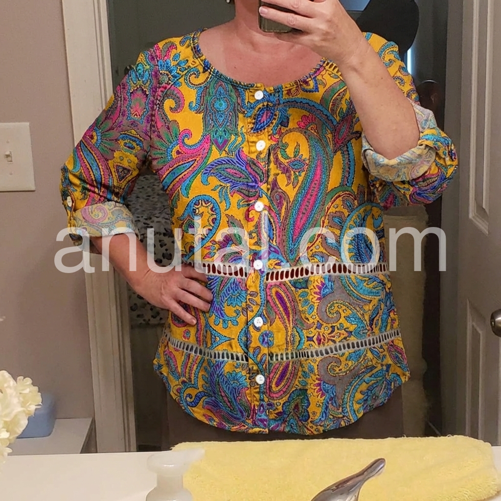 I absolutely love this top! The paisley pattern is so vibrant and beautiful in person. The mustard yellow color really pops. It fits true to size and the length is perfect to wear with leggings or jeans.