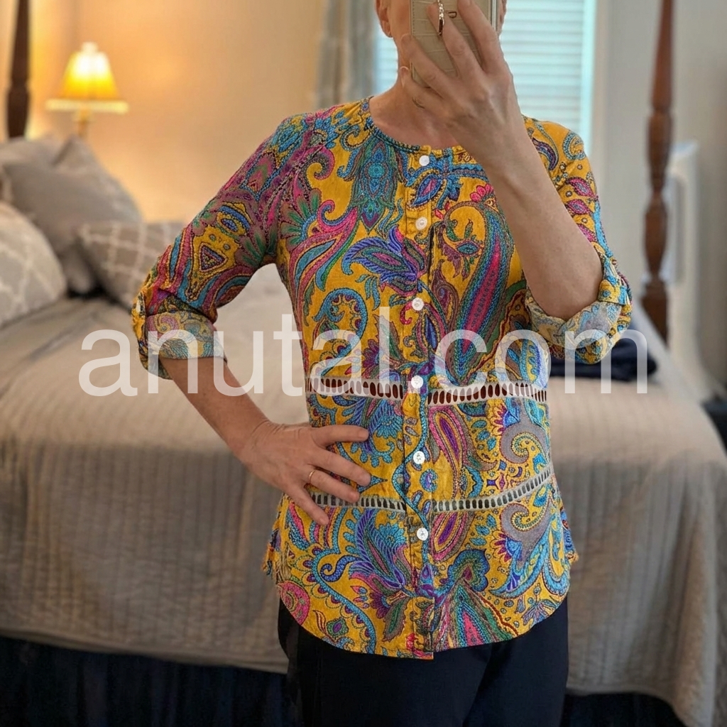 This long-sleeve tunic features a rich yellow base with colorful paisley patterns. The front button design adds vintage charm. Relaxed fit and rolled sleeves for comfort. Perfect for casual wear or bohemian styles. Pair with jeans or leggings for effortless flair.