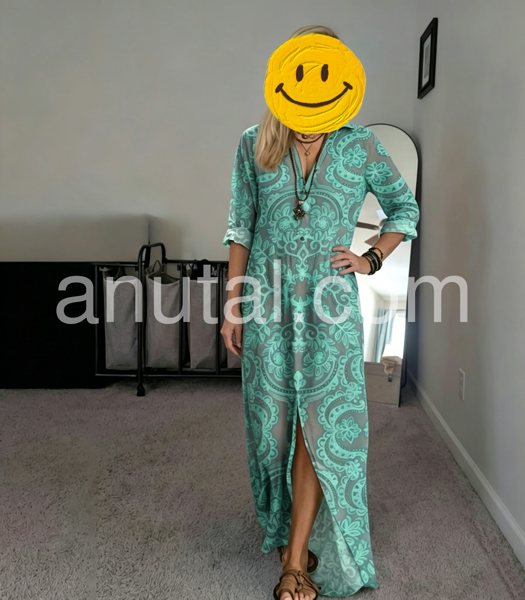 I bought this maxi dress for a beach vacation and it was absolutely perfect! The teal and grey mandala print is gorgeous and looks exactly like the pictures. The material is lightweight and breathable, making it ideal for hot weather. I received so many compliments when I wore it to dinner.
