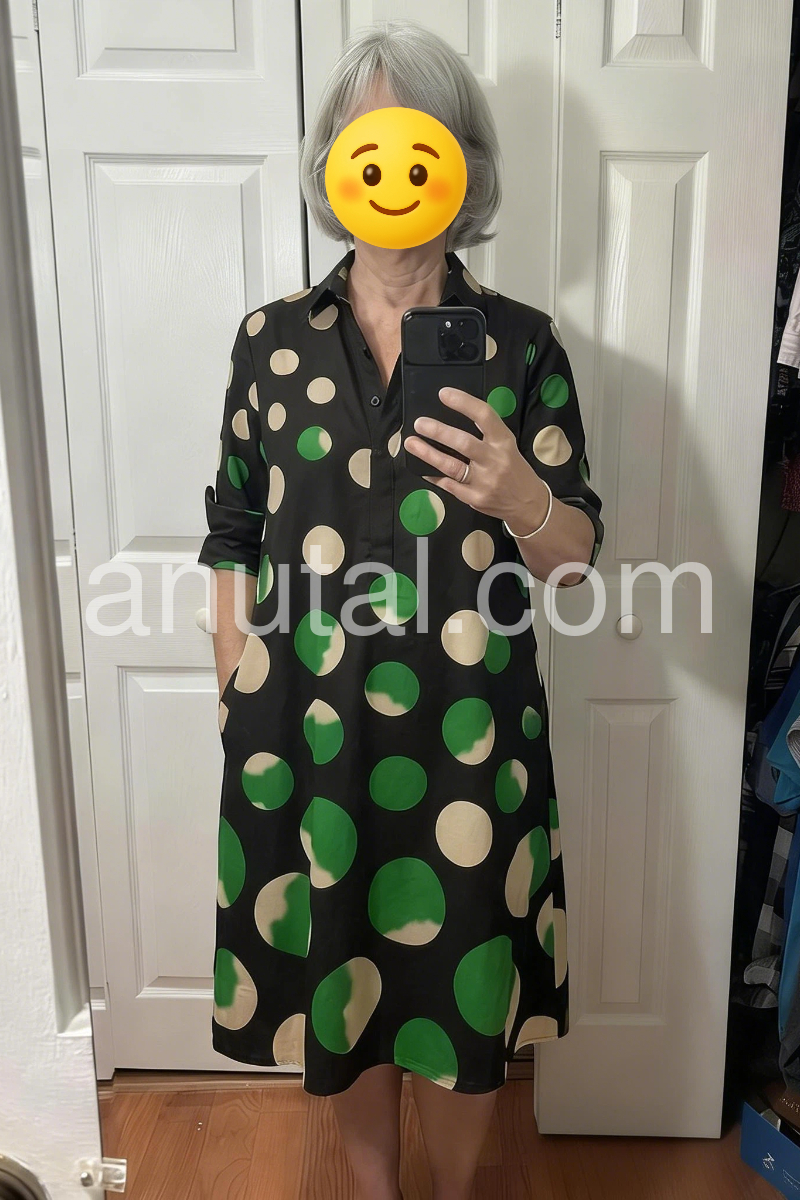 Elevate your casual style with this chic polka dot midi dress. The classic shirt collar, 3/4 sleeves and pockets offer a timeless, polished look.