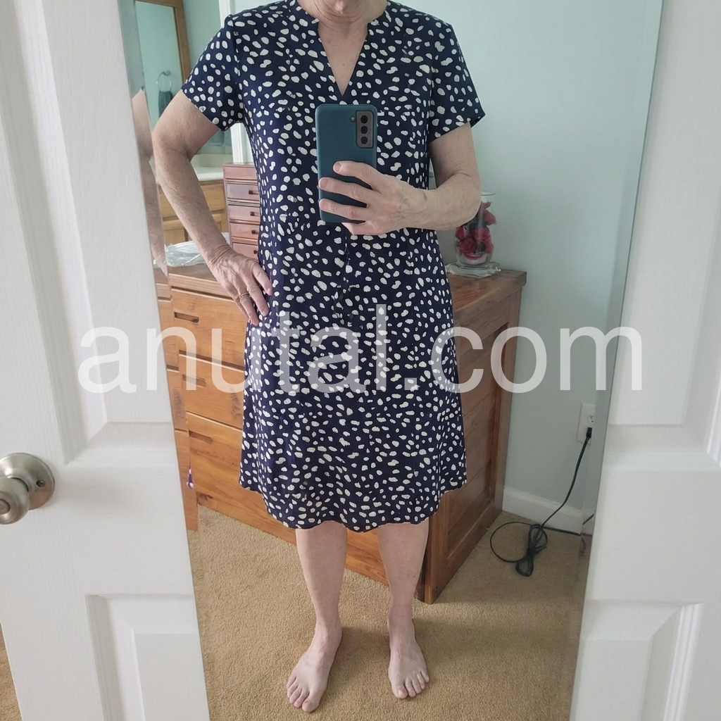 This mid-length dress features a navy base with playful white polka dots and a flattering V-neckline. Short sleeves and a relaxed fit make it perfect for warm days. Lightweight fabric ideal for casual outings or brunch. Pair with heels or sandals for a polished look. Timeless style with a cheerful touch.