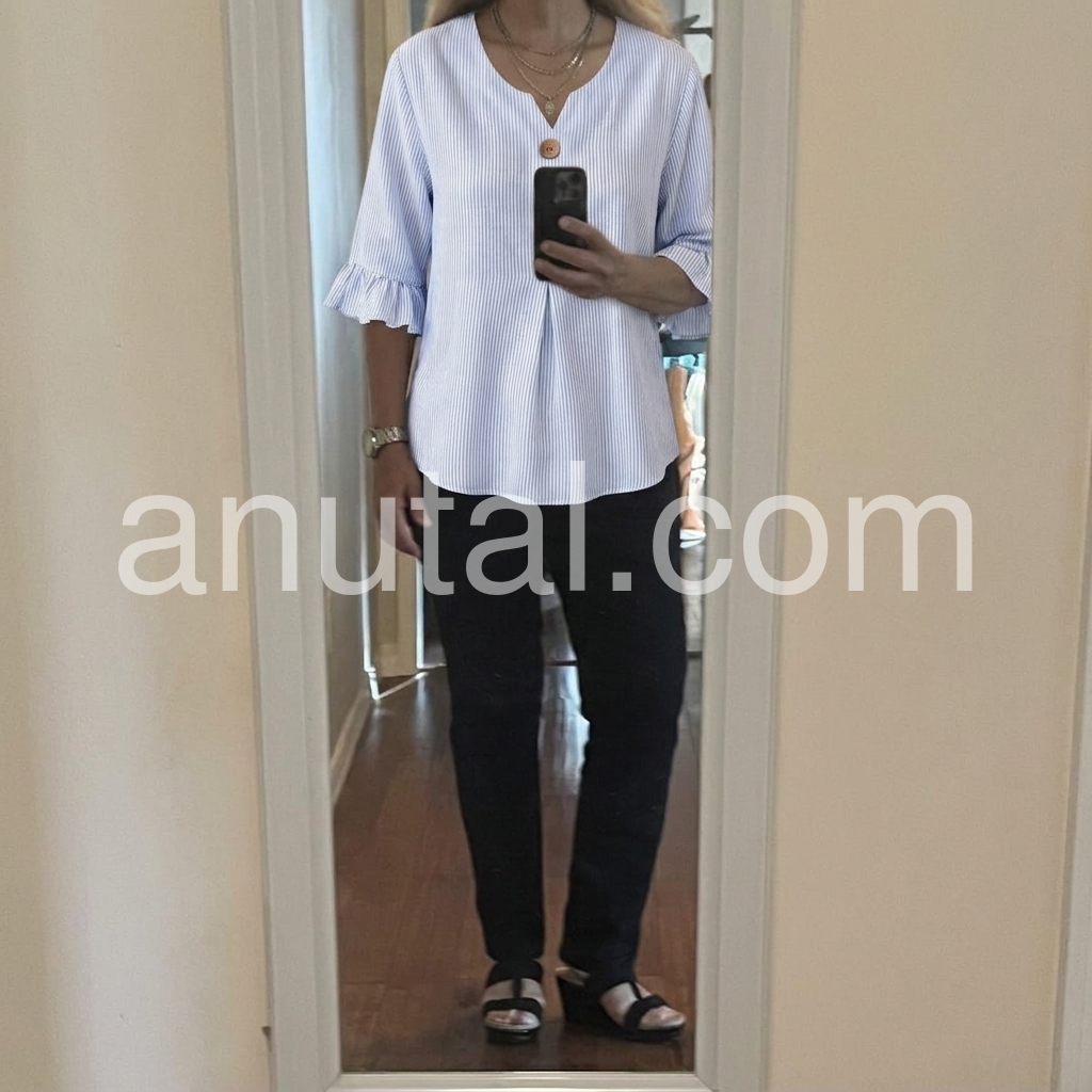 I was pleasantly surprised with the fit of this top. I love the fabric. This can be dressed up with heels and nice slacks, or casual with jeans.