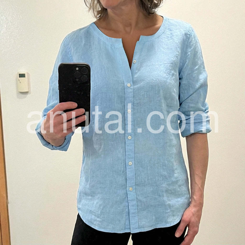 Elevate your everyday style with this Soft Blue Linen-Blend Button Up Blouse, a breath of fresh air for warm-weather wardrobes. Crafted from lightweight, breathable fabric with a subtle linen texture, this blouse offers a relaxed yet polished silhouette that’s perfect for both casual and semi-formal settings. Featuring a clean V-neckline with a split front detail, it adds a touch of modern elegance, while the full-length sleeves can be rolled up for a laid-back, effortless look. The soft sky-blue hue exudes calm sophistication, making it easy to pair with jeans, trousers, or skirts. Whether you're heading to the office, meeting friends for coffee, or enjoying a weekend stroll, this versatile top brings comfort and style in one. Inspired by the minimalist, curated fashion found on Lulus.com, it’s ideal for those who love timeless pieces with a hint of coastal charm. A wardrobe staple that combines simplicity, comfort, and understated beauty—perfect for women who appreciate effortless chic.