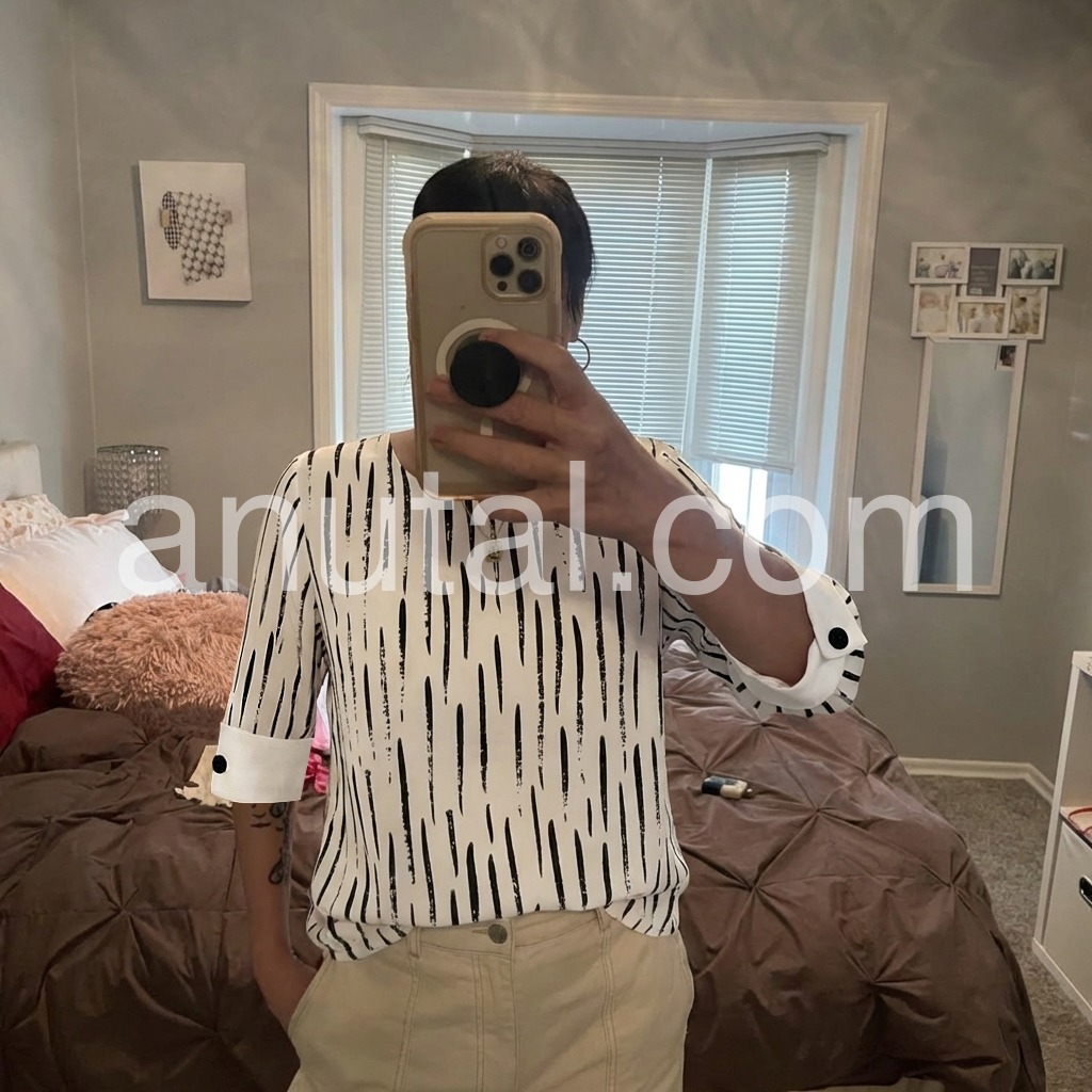Style# 1545417Elevate your everyday wardrobe with understated sophistication. This loose-fit top showcases a striking black brushstroke pattern against crisp white, creating an artistic statement that whispers rather than shouts. The round neckline offers clean minimalism, while three-quarter sleeves with buttoned cuffs introduce a polished, intentional detail. Crafted from a breathable cotton-elastane blend, it moves with you effortlessly—whether you're navigating the office, meeting friends for brunch, or enjoying a weekend escape. The relaxed silhouette flatters all body types while maintaining an air of refined ease. Machine washable for hassle-free care. This is the piece that transforms a basic outfit into something memorable.