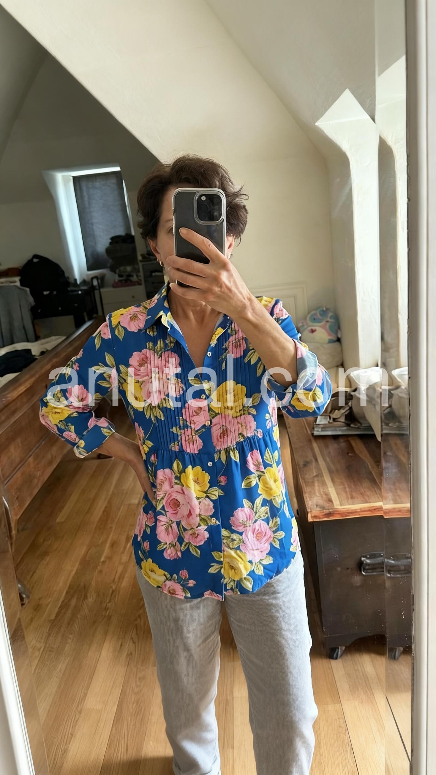 Absolutely love the vibrant blue color and the pink and yellow flowers! It is perfect for spring. The fit is true to size and it looks great with jeans.
