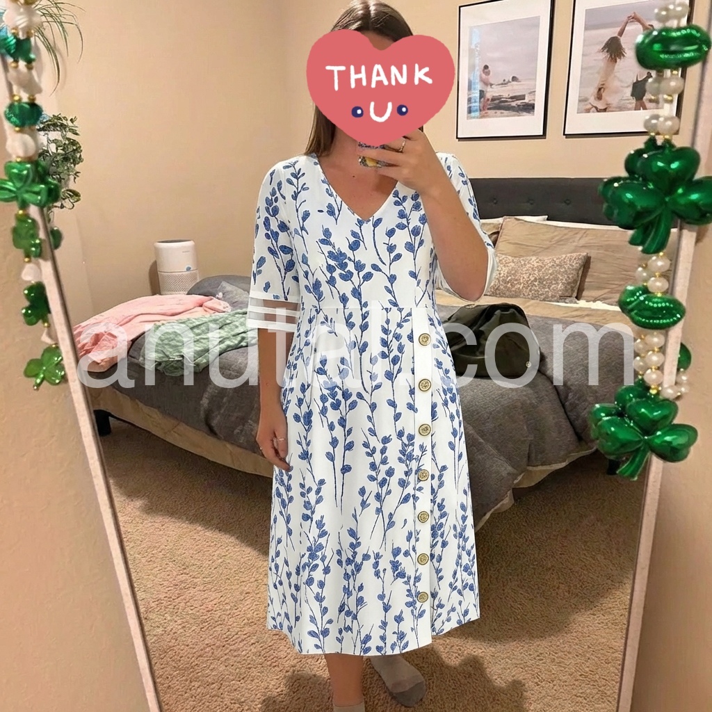 This dress is a masterclass in effortless elegance, solving the dilemma of “what to wear” for both casual and semi-formal occasions. The delicate blue floral print feels fresh and timeless, while the V-neckline adds a subtle hint of allure without being too revealing.