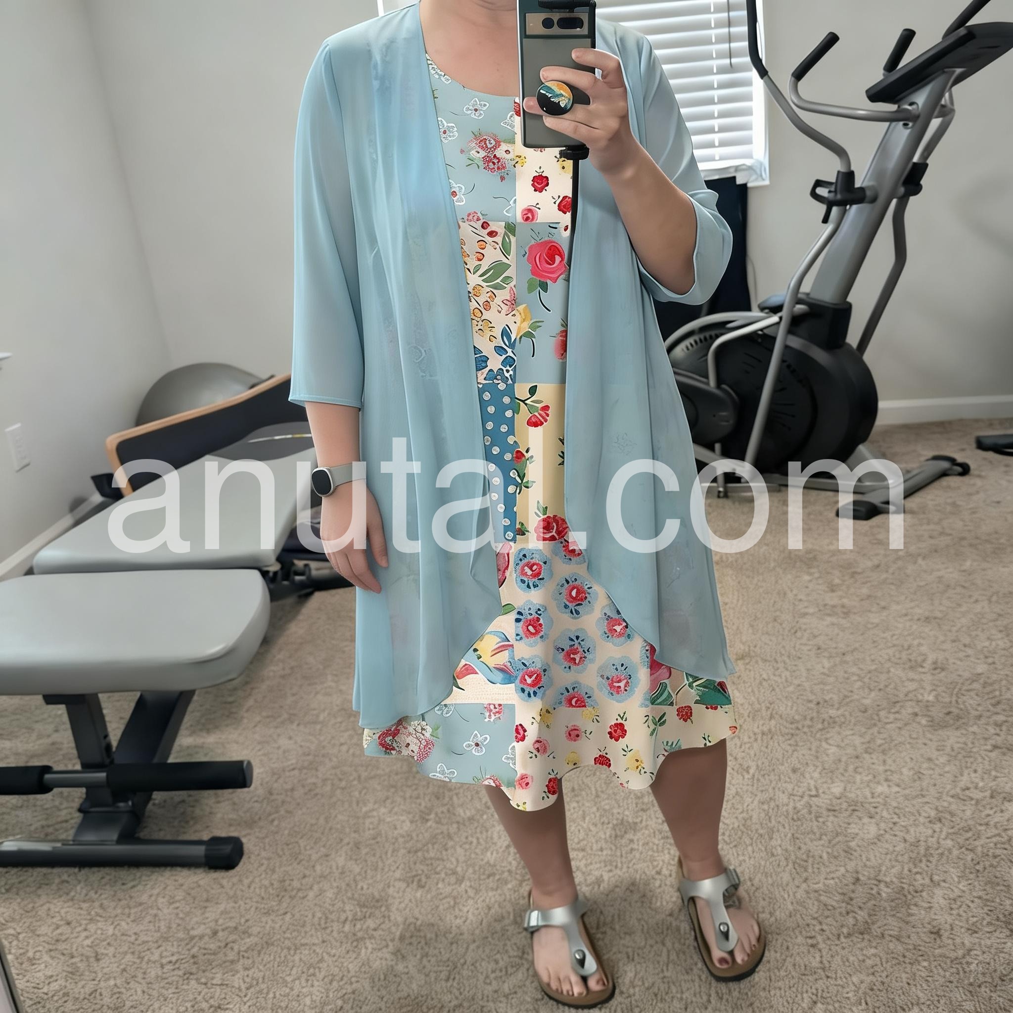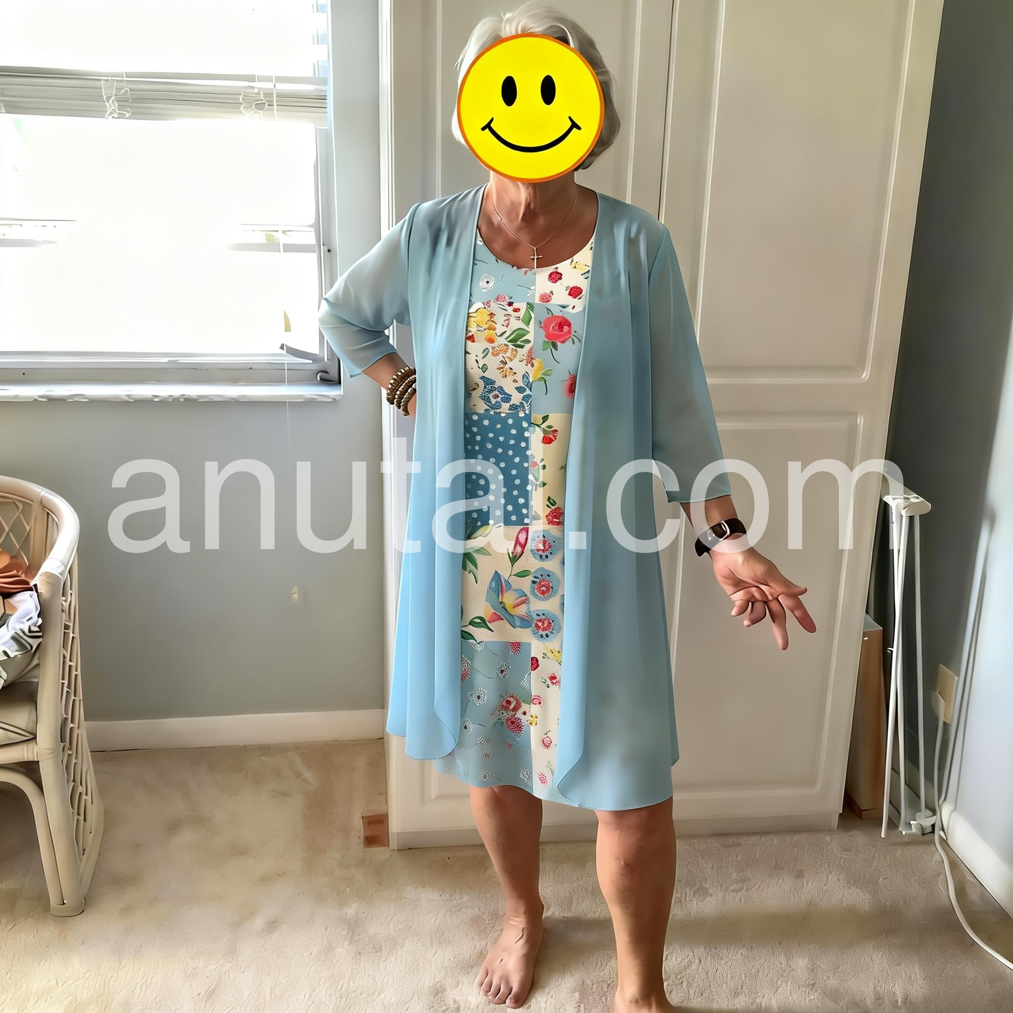 This colorful dress features a patchwork design with floral and polka dot patterns. Paired with a flowing light blue jacket for a layered look. Lightweight and perfect for spring or summer days. Ideal for casual outings or garden events. Stylish and full of charm.