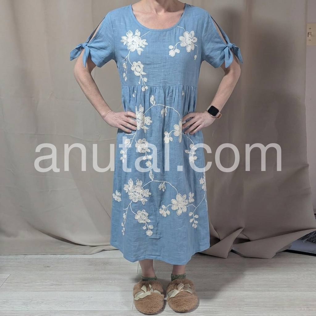 Designed to fix the "boring summer dress" pain point, this dress features intricate floral embroidery that elevates basic linen. The tie sleeves solve the "arm fat" concern, while the flowy tiered hem skims over hips and thighs.