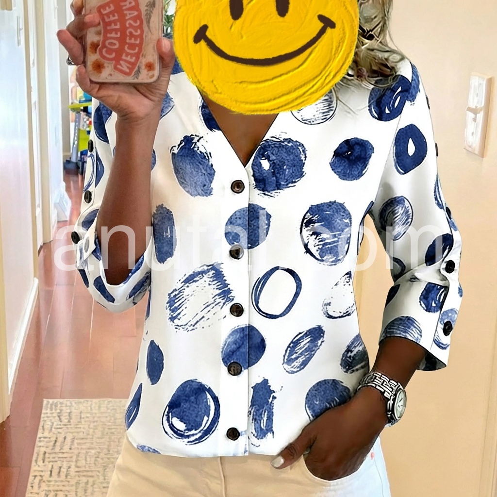 This V-neck blouse features a bold blue abstract dot print on a white background. Button-down front with three-quarter sleeves and button cuffs. Relaxed fit perfect for casual wear. Ideal for pairing with jeans or shorts. Modern and eye-catching design.