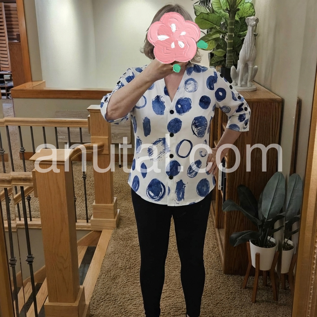 I absolutely love this top! The blue watercolor circles are so unique and vibrant. I wore it to a casual brunch and received so many compliments. The material is soft and breathable.