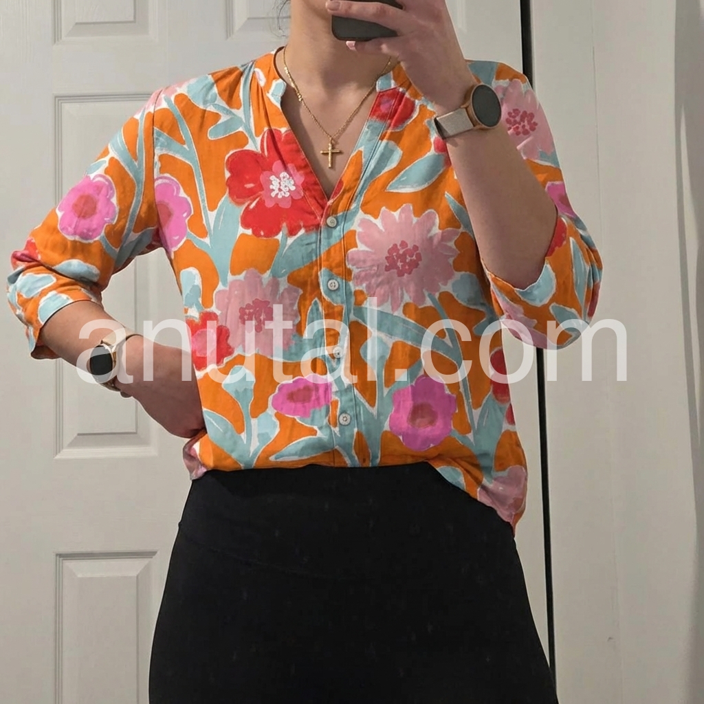 I absolutely love this top! The colors are incredibly vibrant, exactly as pictured. The orange and pink floral pattern is perfect for spring and summer. It fits true to size and the material is soft and breathable. Highly recommend!