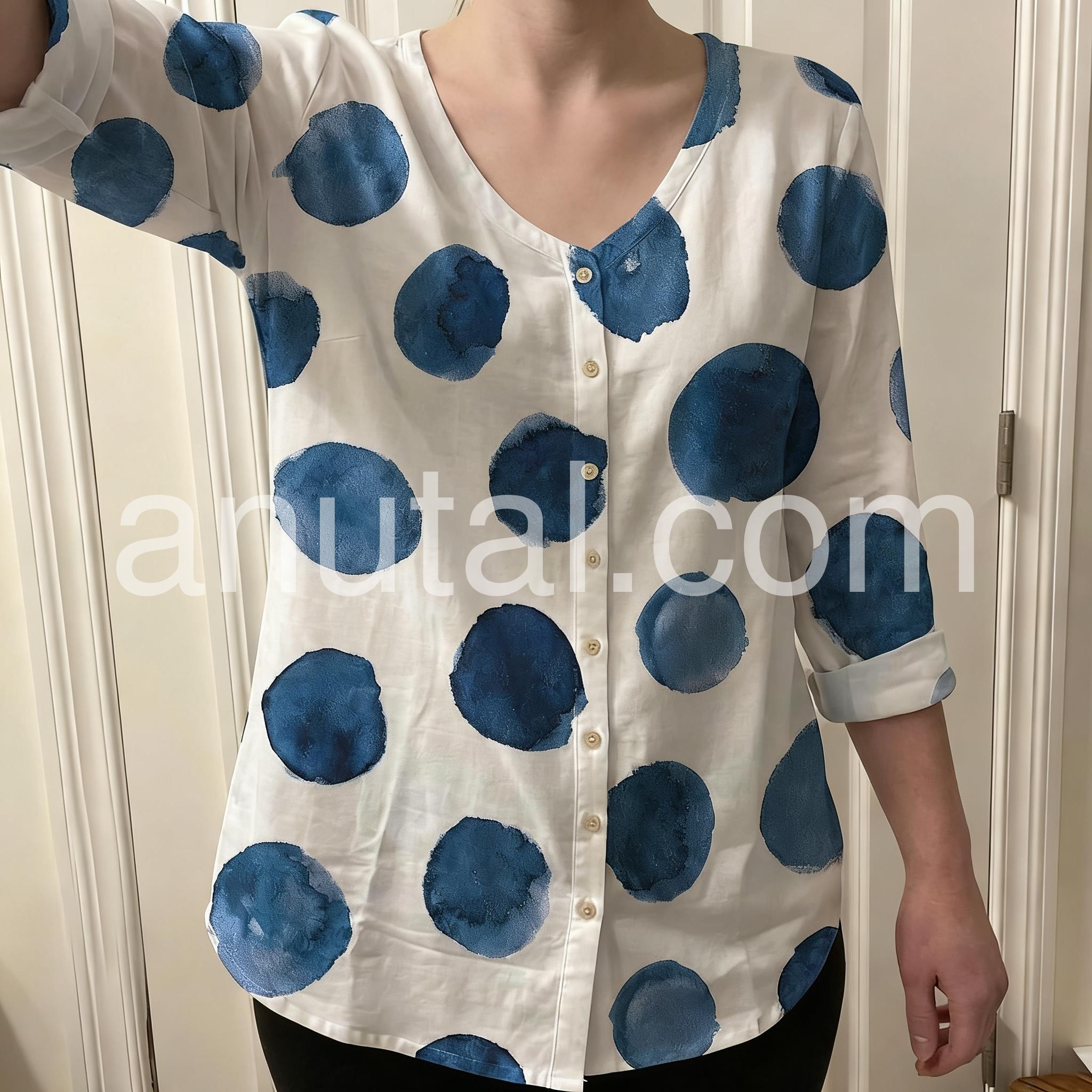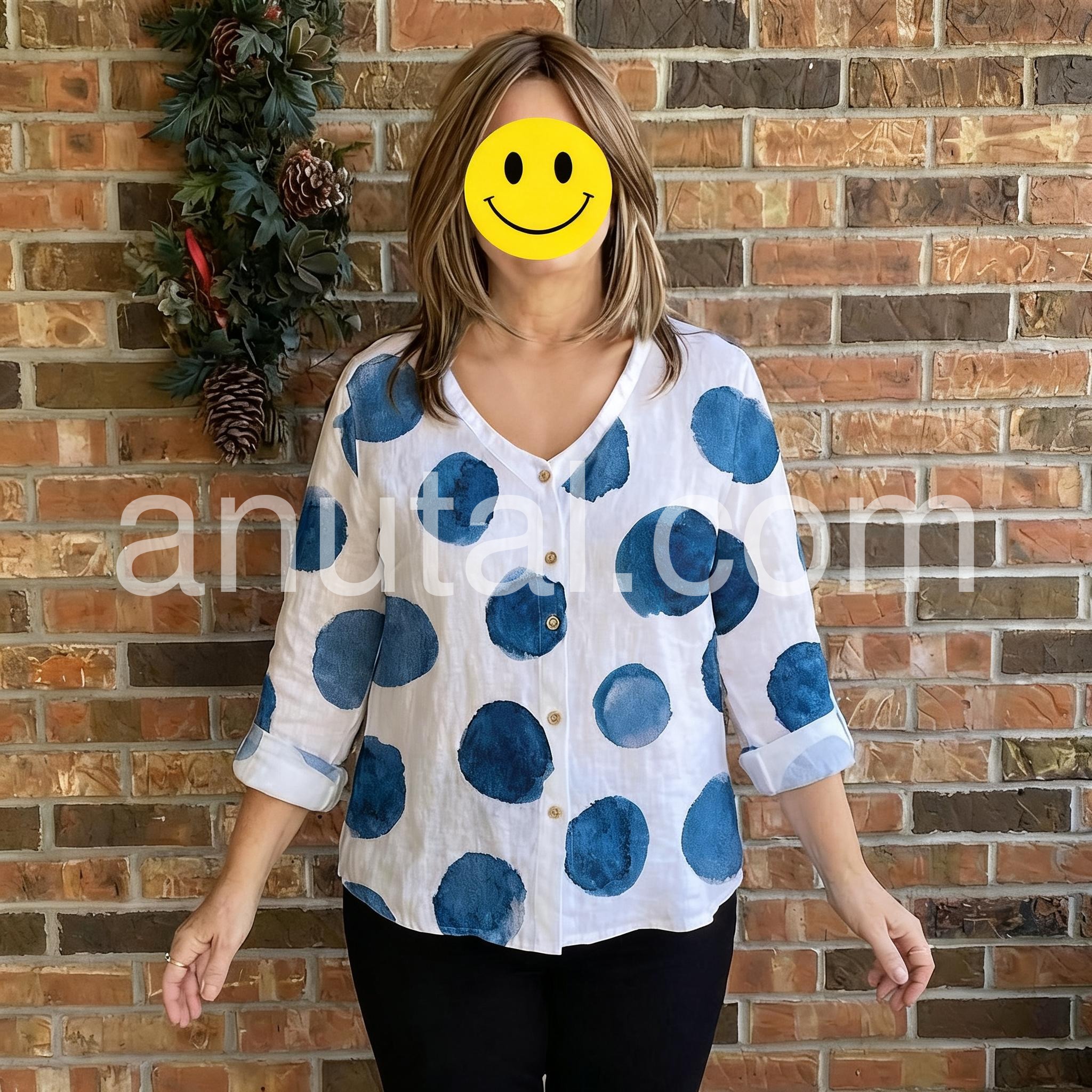 This button-down blouse features a playful watercolor polka dot print in navy blue on a crisp white background. The V-neckline and three-quarter sleeves offer a relaxed, comfortable fit. Lightweight fabric makes it perfect for everyday wear. Pair with jeans or shorts for a stylish casual look. Effortlessly trendy with a touch of artistic flair.