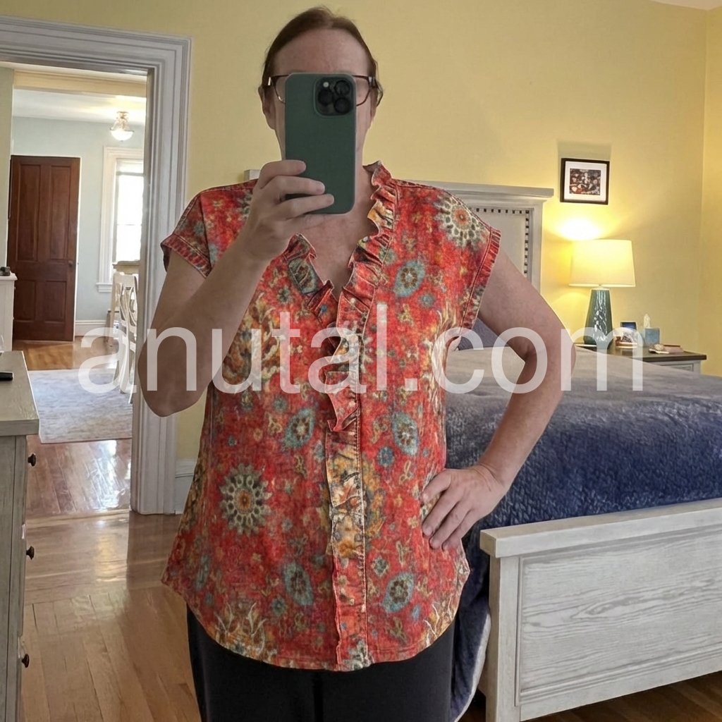 Absolutely fantastic top! The fit is spot on and the ruffled V-neck is super flattering. I love the vintage, faded look of the red background mixed with the bright blue and yellow floral accents. It is my go-to shirt when I want to look put together but remain comfortable.