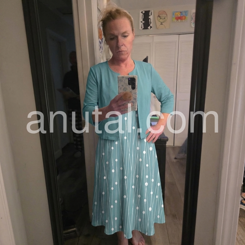 This flowing midi dress with white polka dots on a turquoise background. Paired with a matching short sleeve jacket for a polished look. Comfortable and stylish for casual outings or garden events. Lightweight fabric perfect for warm days. Effortlessly chic and feminine.