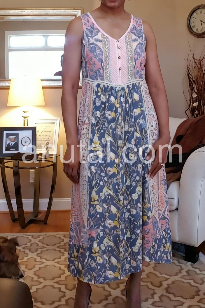 This sleeveless midi dress features a vibrant blue floral print with delicate embroidery details. The V-neck and button-down front add a touch of charm. Lightweight fabric perfect for summer days. Ideal for beach outings or casual events. Effortlessly stylish with a bohemian flair.