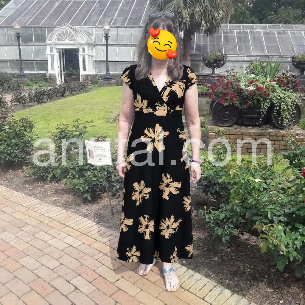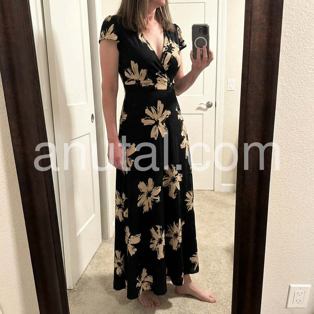 I absolutely love this dress! The black and beige floral pattern is incredibly striking and elegant. I wore it to a beach wedding and received so many compliments. The v-neck is flattering without being too revealing, and the material is soft and flowing. Highly recommend!