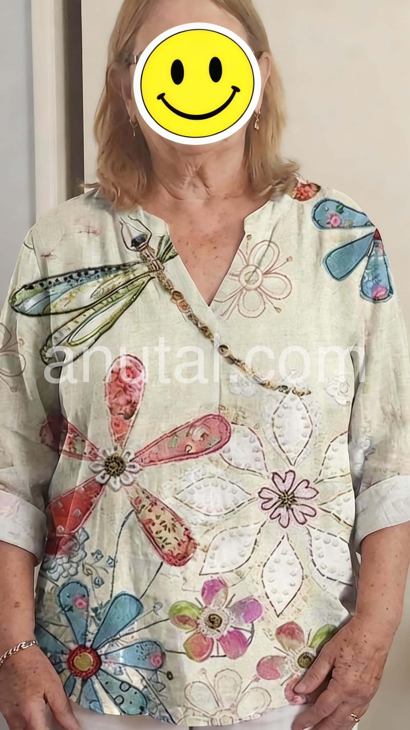 This loose-fitting top features a colorful floral and dragonfly print on a soft neutral base. V-neck with button detail adds a relaxed charm. Long sleeves with rolled cuffs for easy styling. Lightweight and perfect for warm days. Effortlessly bohemian with artistic flair.