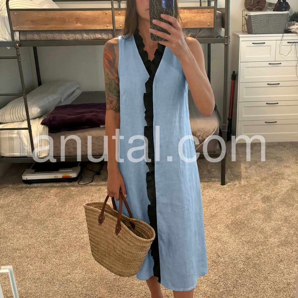 Sky Blue Black Ruffle Sleeveless Midi Dress
