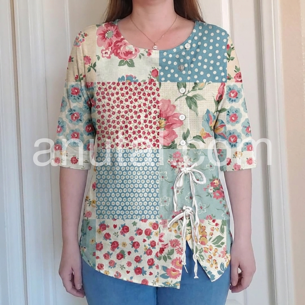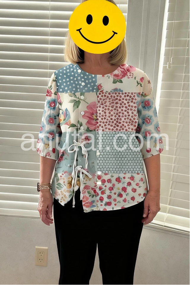 This loose-fitting top features a charming patchwork design with floral and polka dot patterns. Rounded neckline with front buttons and side drawstring for a relaxed fit. Short sleeves and asymmetrical hem add style. Lightweight and perfect for casual wear. Ideal for spring and summer days.