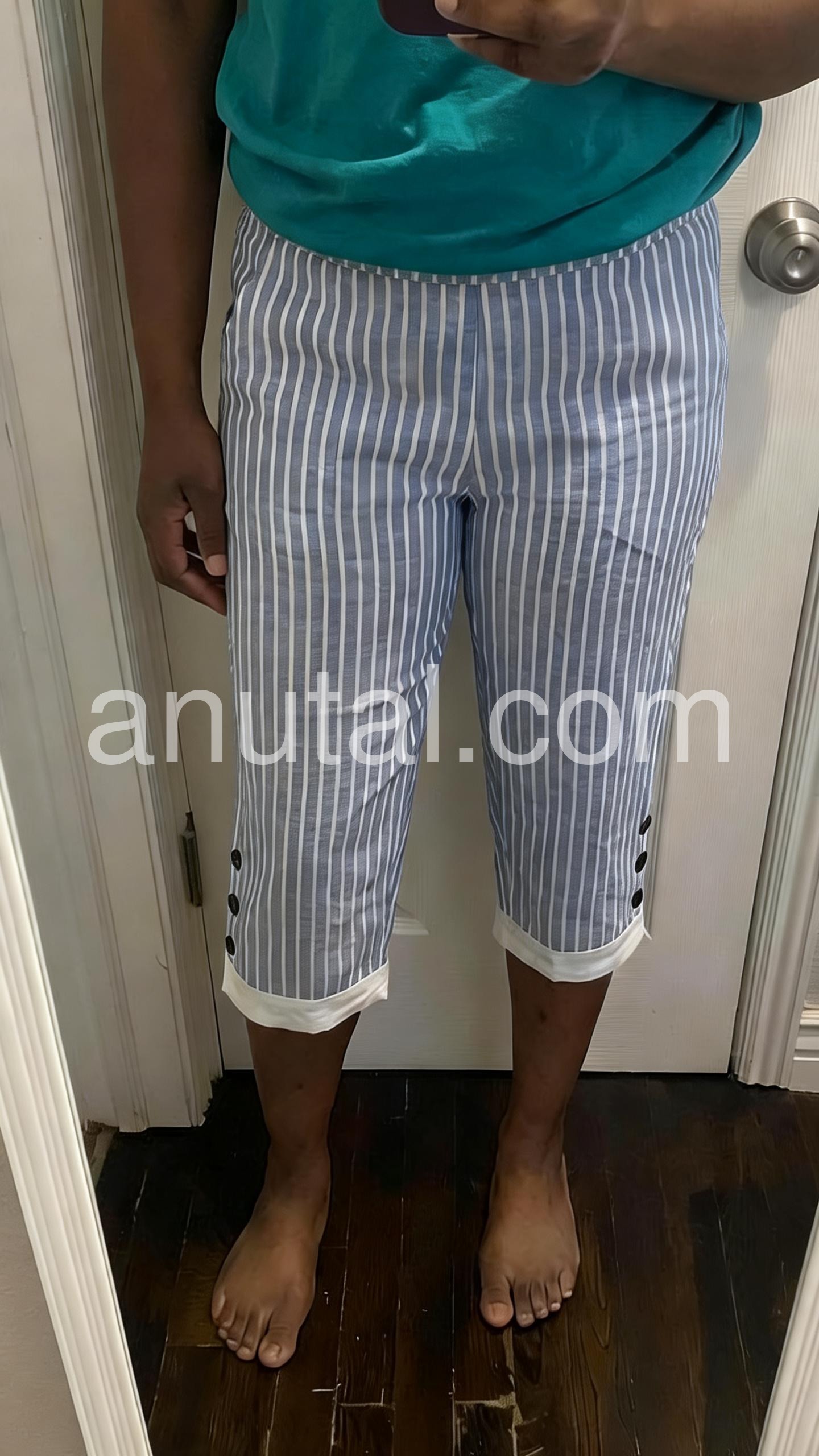 These mid-length capris feature vertical blue and white stripes with a relaxed fit. Side pockets and button details add practical style. Cuffed hems and elastic waistband for comfort. Lightweight fabric perfect for warm weather. Ideal for casual walks or beach days.