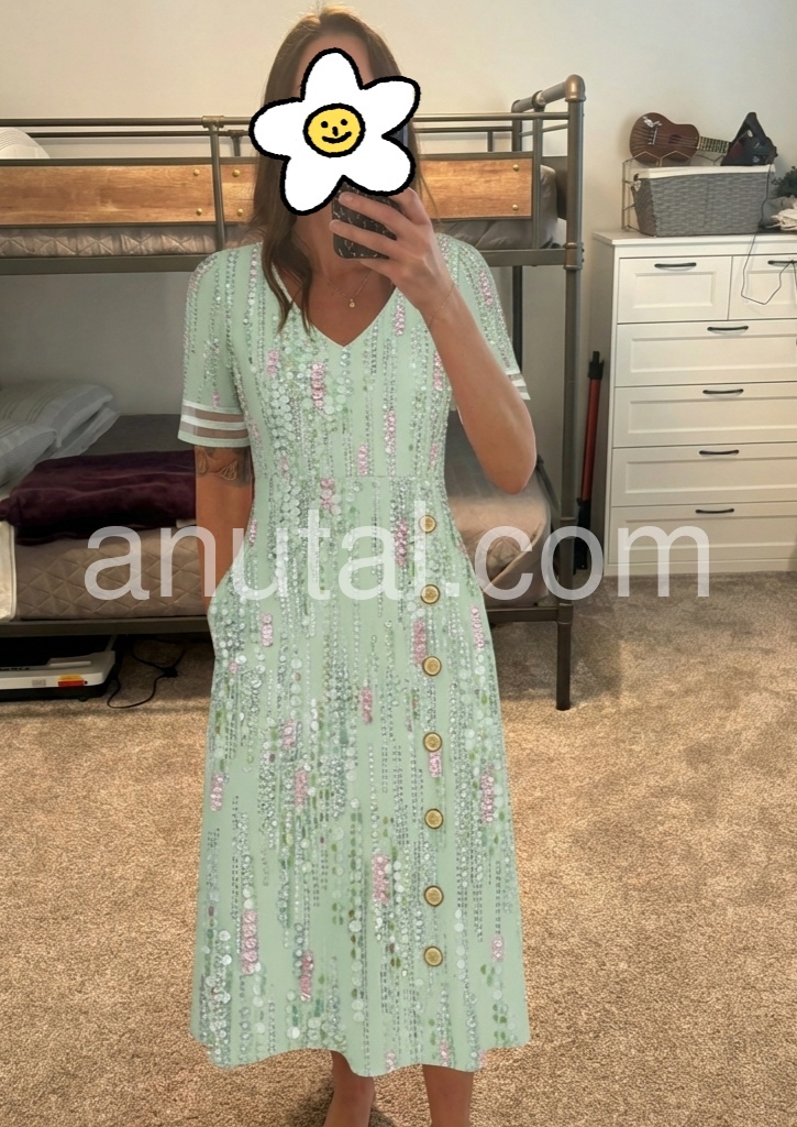 This midi dress is a celebration of feminine glamour. The V-neck, side button placket, and pockets create a flattering, practical silhouette, perfect for special events.