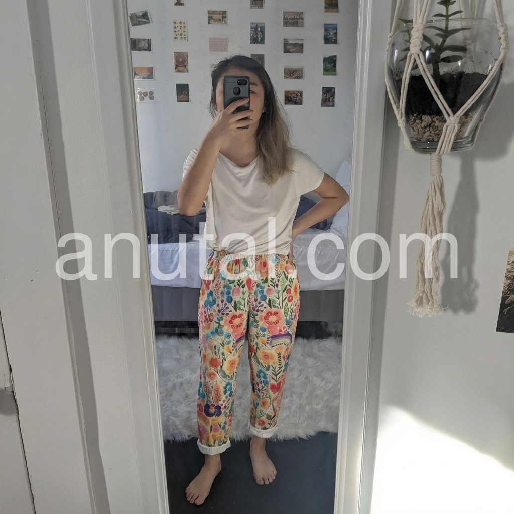 These are the most comfortable pants I own right now. The floral design with the little rainbows is so happy and uplifting. Perfect for a cruise or vacation.