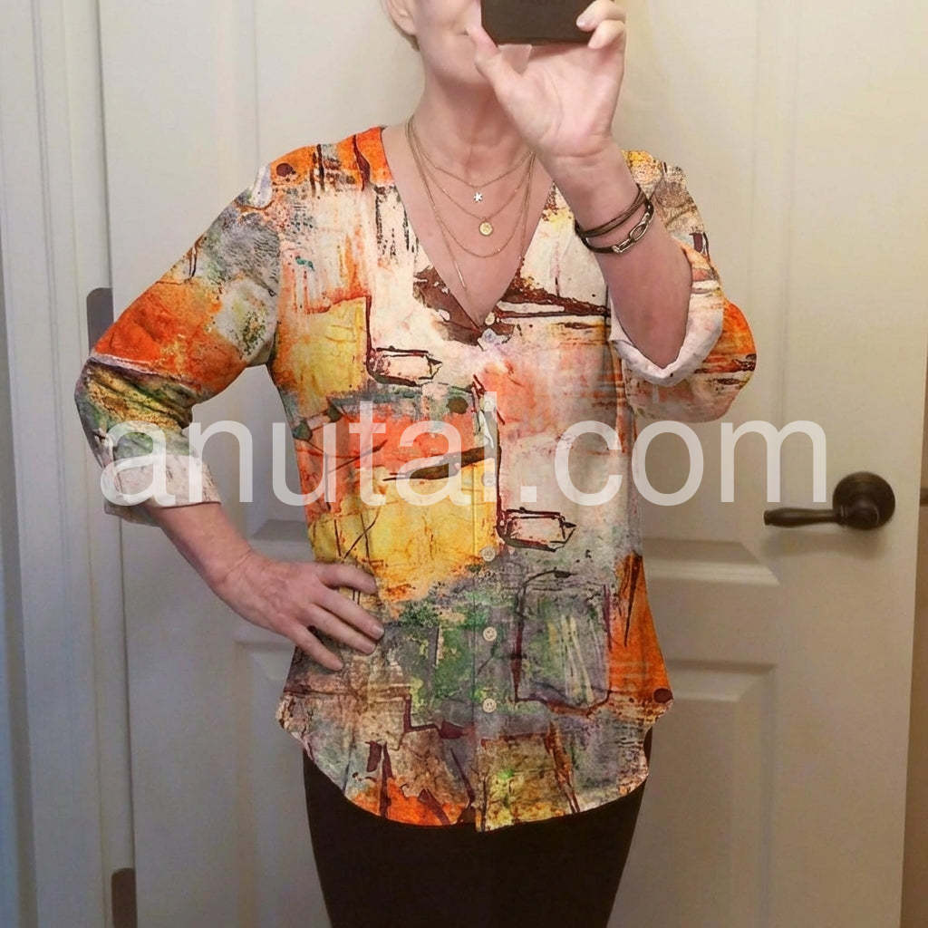 Style# 1544471Make a bold fashion statement with this Chic Abstract Watercolor Print Top, a one-of-a-kind top that turns wearable art into everyday elegance. Crafted from soft, lightweight fabric—likely cotton or rayon blend—this blouse features a vibrant, painterly design inspired by watercolor strokes and abstract expressionism. The print blends warm tones of orange, rust, mustard, teal, and cream, creating a dynamic and artistic look that’s both eye-catching and sophisticated. Styled here with distressed denim and layered jewelry, it’s ideal for weekend outings, creative gatherings, or adding a burst of personality to your daily wardrobe. Whether you're heading to brunch or exploring the city, let this abstract-print top elevate your style with creativity, comfort, and boho flair.