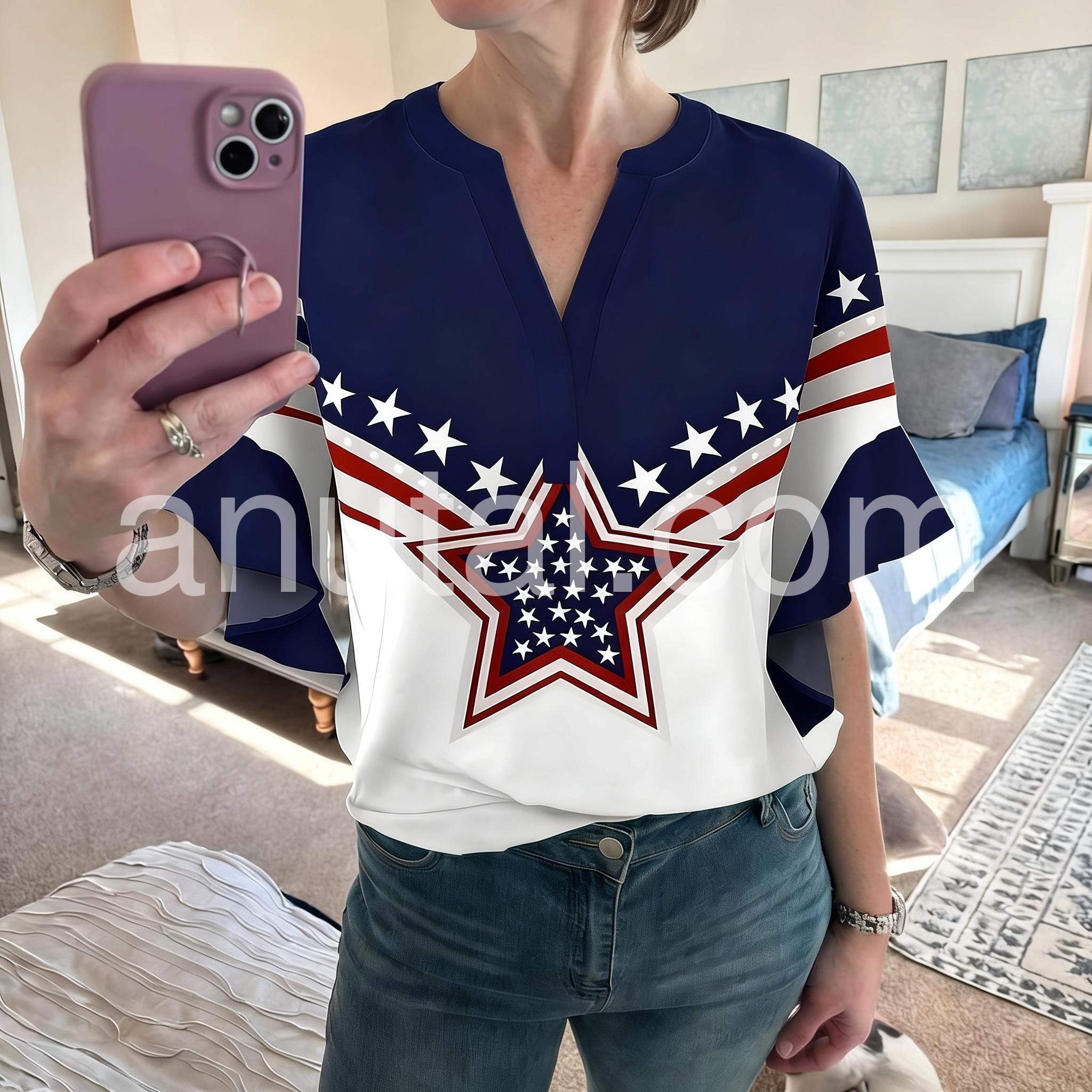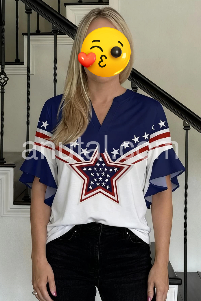 This V-neck top features a bold American flag-inspired design with red, white, and blue stars. The ruffled sleeves add a feminine flair. Loose fit for comfort and ease. Perfect for 4th of July or patriotic events. Ideal for casual summer wear.