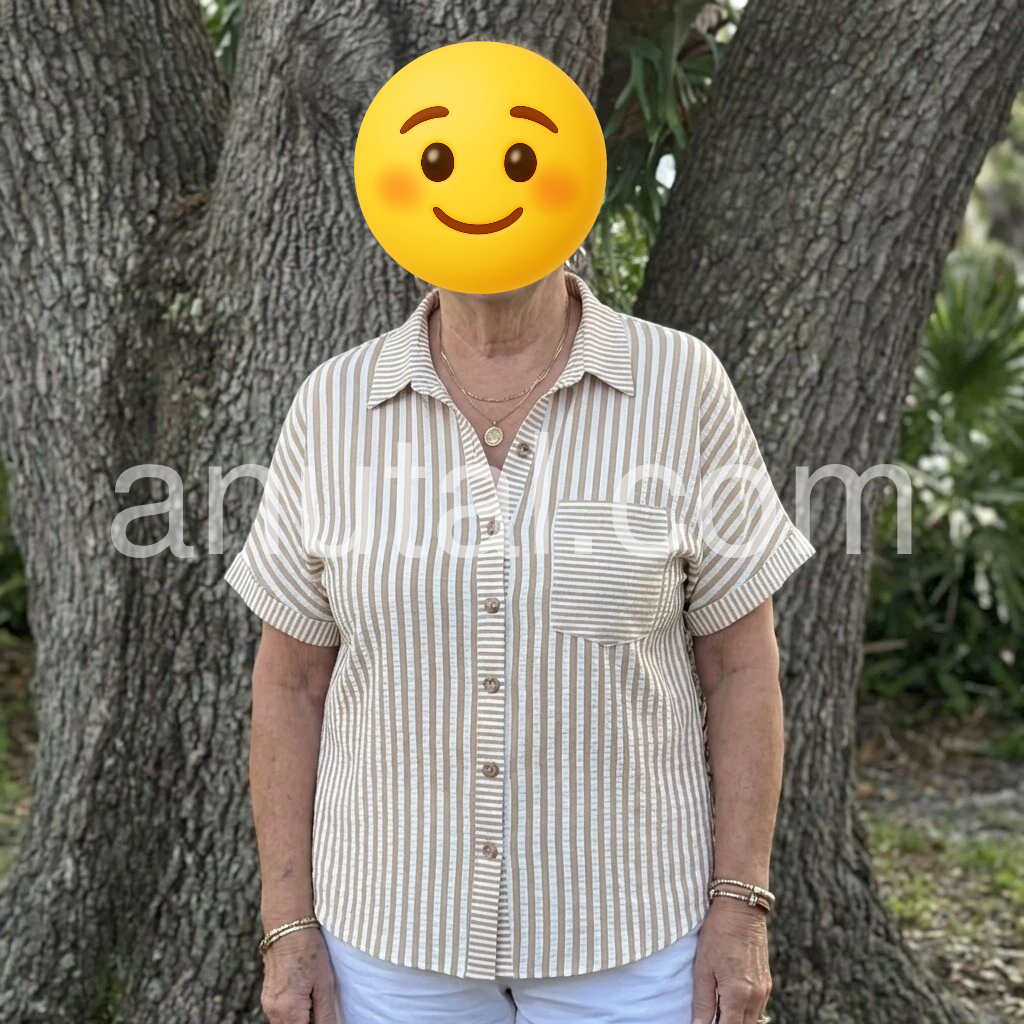 This short-sleeve shirt features vertical brown and white stripes with a classic collar. Front button closure and chest pocket add practical style. Soft, lightweight fabric for all-day comfort. Perfect for casual wear or layering. Effortlessly chic and easy to pair.
