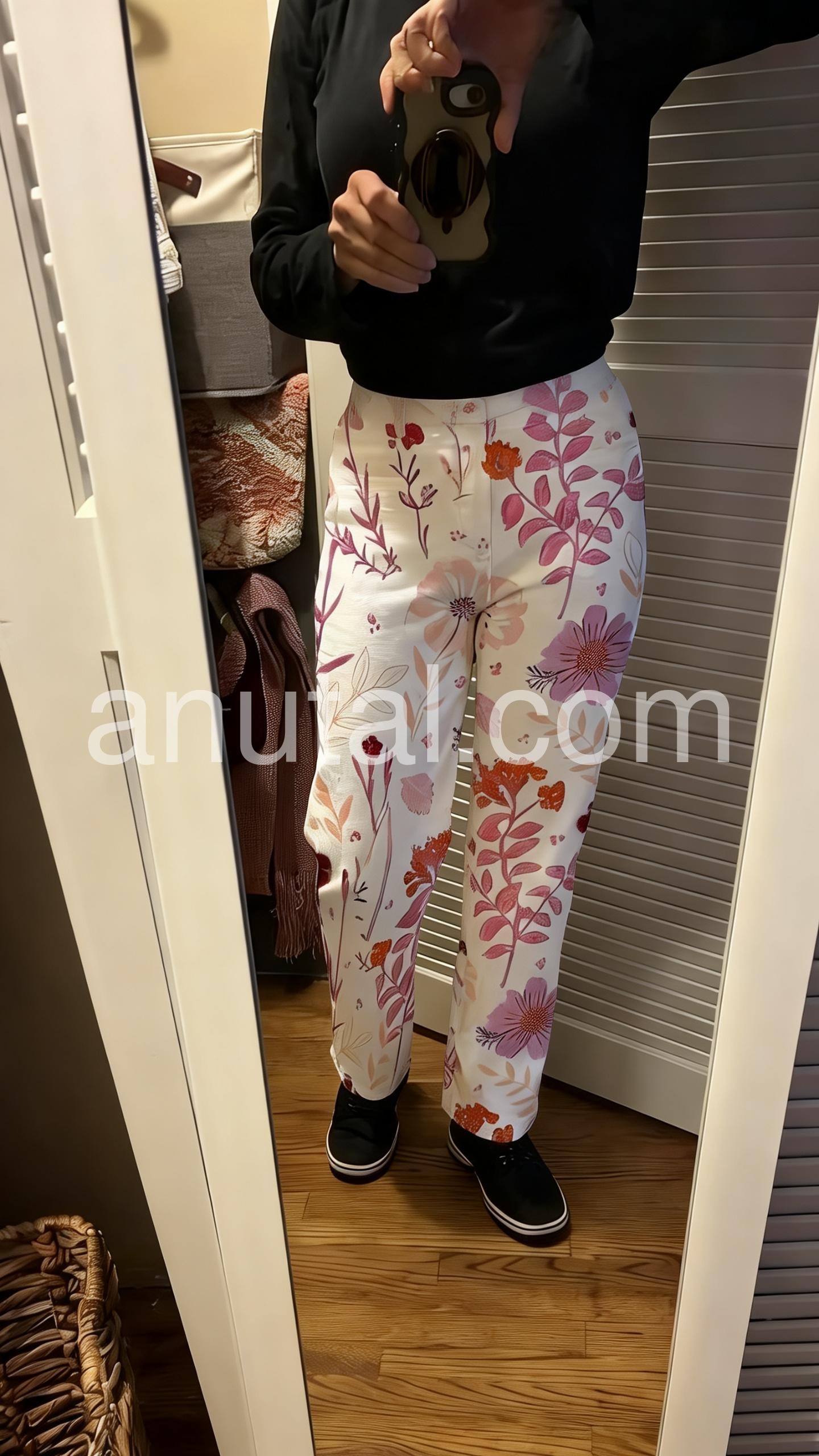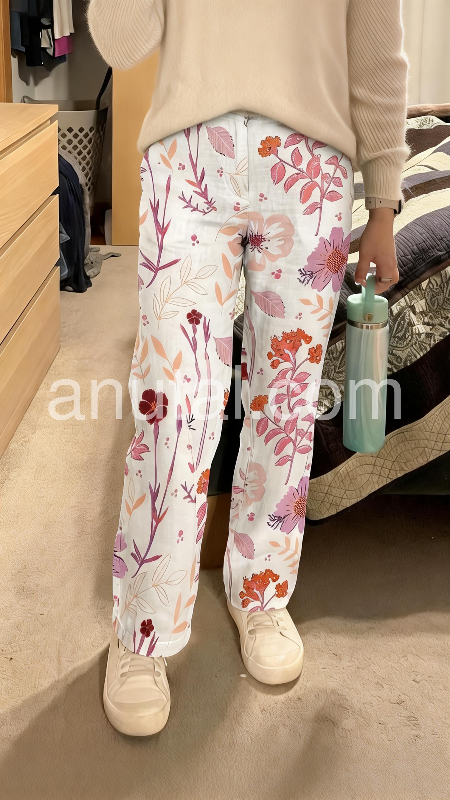 These loose-fit pants feature a vibrant floral pattern in soft pinks, purples, and oranges on a white base. Elastic waistband with side pockets for comfort. Wide-leg design with a relaxed, flowing silhouette. Perfect for casual wear or garden outings. Lightweight fabric ideal for warm days.