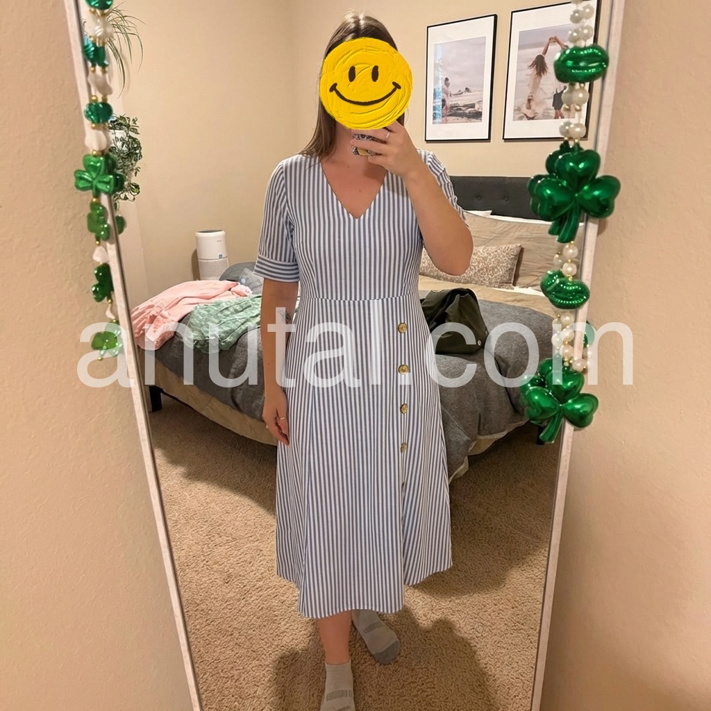 This is a cute casual summer dress.Super comfortable. Good quality stitching and buttons are all securely sewn on. It has pockets!! So that really nice. Perfect length.
