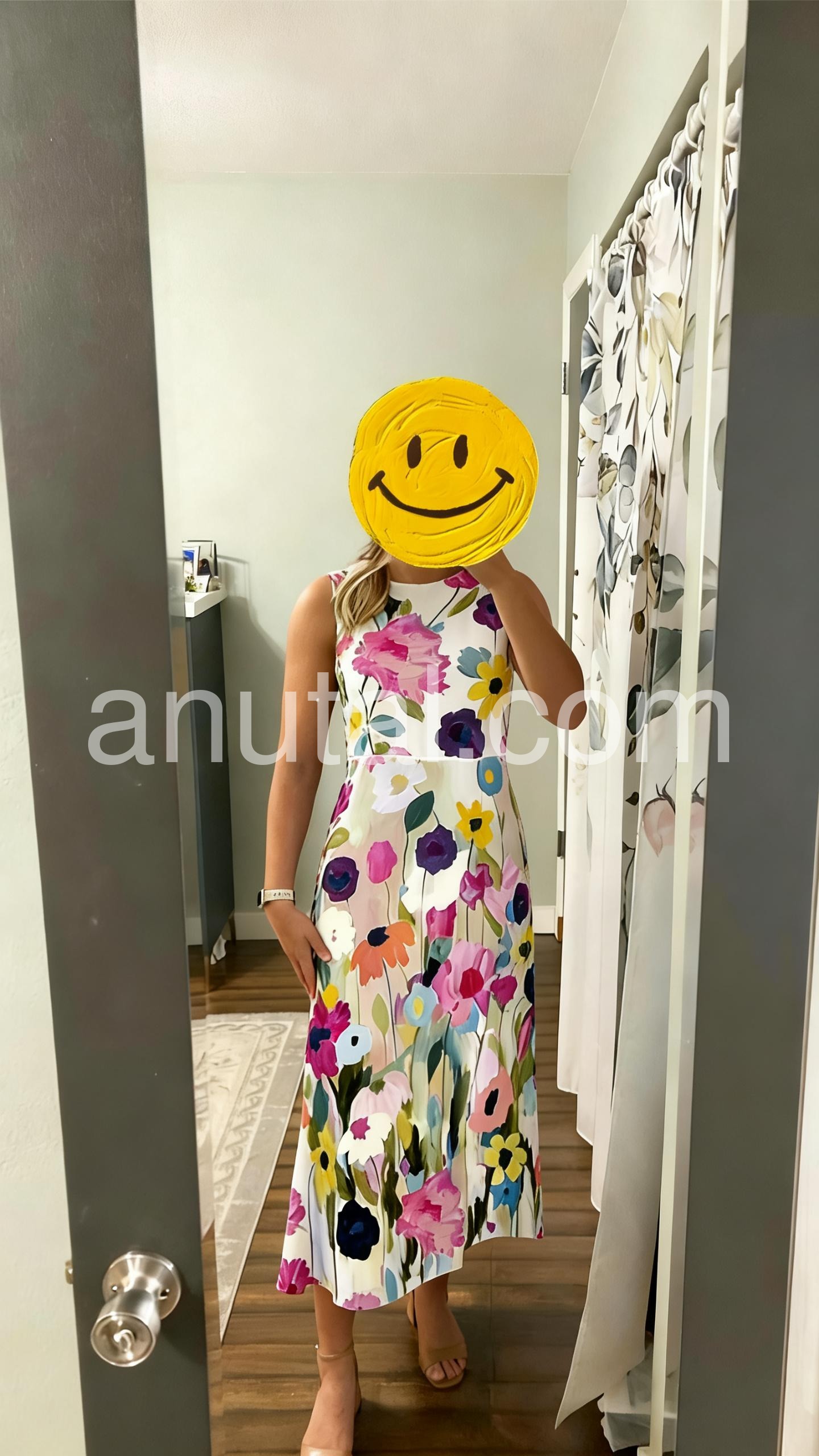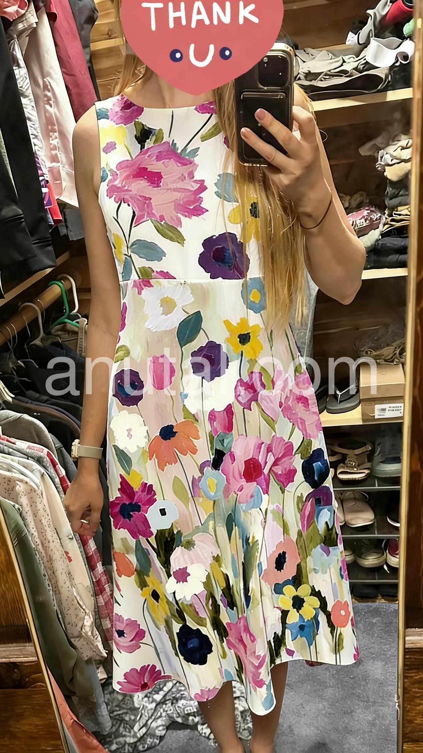 This sleeveless midi dress features a vibrant watercolor floral print on a white base. The round neckline and flowy silhouette add elegance. Perfect for summer days or garden parties. Lightweight fabric for comfort and ease. Ideal for beach outings or casual events.