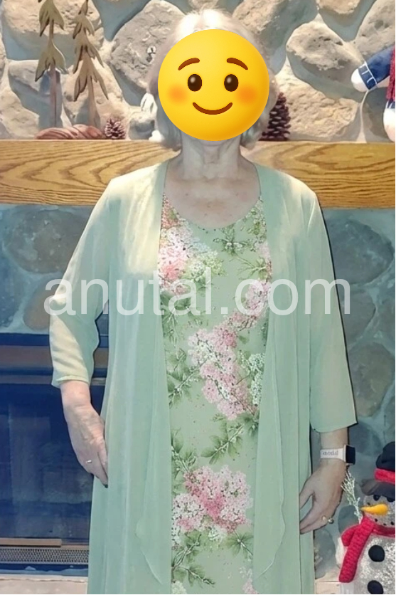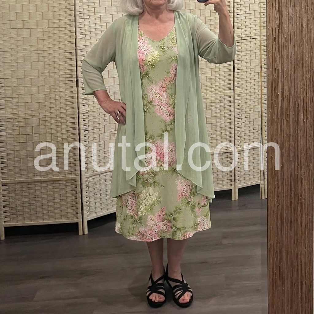 This soft floral dress features a light green base with pink and white blossoms. Paired with a matching sheer duster for a layered look. V-neckline and relaxed fit perfect for warm days. Ideal for garden parties or casual outings. Fresh and feminine style.